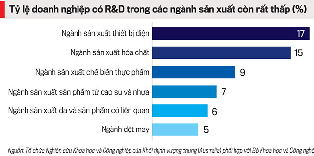 Theo đó, tỷ lệ doanh nghiệp có R&D trong các ngành sản xuất còn rất thấp như: ngành sản xuất thiết bị điện 17%, ngành sản xuất hóa chất 15%, ngành sản xuất chế biến thực phẩm 9%, ngành sản xuất sản phẩm từ cao su và nhựa 7%, ngành sản xuất da và sản phẩm có liên quan 6%, ngành dệt may 5%…
