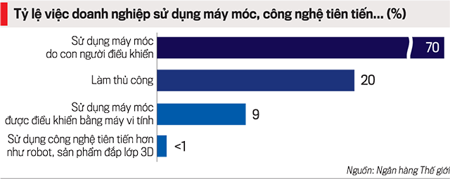 Tuy nhiên, nghiên cứu của Ngân hàng Thế giới (WB) công bố đầu tháng 11/2021, cho thấy 70% doanh nghiệp trong ngành công nghiệp chế biến, chế tạo của Việt Nam vẫn sử dụng máy móc do con người điều khiển, 20% làm thủ công, chỉ 9% sử dụng máy móc được điều khiển bằng máy vi tính và dưới 1% sử dụng công nghệ tiên tiến hơn như robot, sản phẩm đắp lớp 3D…