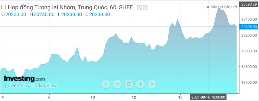 Giá nhôm kỳ hạn giao tháng 9 trên sàn Thượng Hải (hợp đồng giao dịch nhiều nhất) ngày 17/8 đạt 20.575 nhân dân tệ (3.175,74 USD)/tấn, tăng 1,6% so với phiên liền trước và đạt mức cao nhất kể từ tháng 8 năm 2008. Được biết, từ ngày 22/7 đến nay, giá nhôm trên sàn Thượng Hải luôn ở mức trên 19.000 nhân dân tệ (2.934 USD)/tấn.