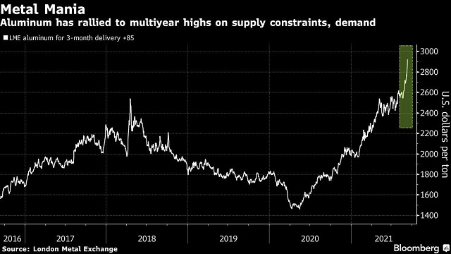 Giá nhôm đã tăng 48% kể từ đầu năm nay do nhu cầu tăng mạnh, hoạt động vận chuyển bị tắc nghẽn và Trung Quốc hạn chế sản xuất. Đà tăng giá của kim loại này dấy lên lo ngại về lạm phát và trở thành vấn đề đau đầu của các nhà sản xuất hàng tiêu dùng vốn cũng đang bị ảnh hưởng bởi tình trạng thiếu hụt nguyên liệu và chi phí sản xuất tăng vọt.