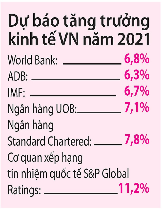 Ngân hàng Standard Chartered dự báo Việt Nam sẽ đạt mức tăng trưởng 3% trong năm 2020 và 7,8% vào năm 2021, hoạt động tiêu dùng gia tăng nhờ tâm lý thị trường được cải thiện và lĩnh vực sản xuất tăng tốc sẽ là động lực tăng trưởng chính trong quý IV/2020. Ngân hàng Thế giới dự báo kinh tế Việt Nam tăng trưởng 2,5-3% năm 2020.