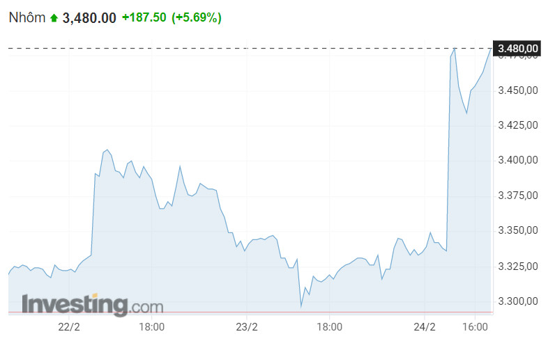 Giá dầu, giá khí đốt tăng mạnh đồng thời lo lắng về các lệnh trừng phạt đối với Nga – một cường quốc sản xuất nhôm đã đẩy giá nhôm trên sàn giao dịch London (LME) chiều nay (giờ Việt Nam) tăng vọt lên 120 usd/tấn khi mở cửa phiên giao dịch 24/2. Có thời điểm giá nhôm đạt 3.491 usd/tấn gần chạm mốc 3.500 usd.