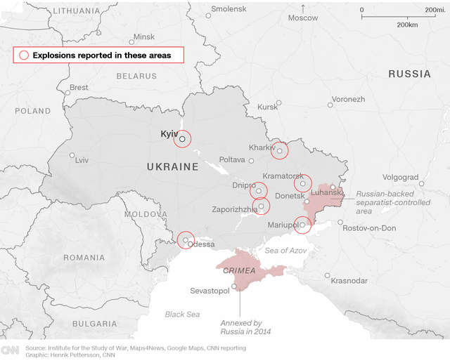 Vài phút sau tuyên bố của ông Putin, phóng viên NBC News ở thủ đô Kiev của Ukraine cho biết họ đã nghe thấy các vụ nổ trong thành phố. Nhóm phóng viên CNN tại Kharkiv, một thành phố Ukraine gần biên giới Nga, cũng nghe thấy tiếng pháo.