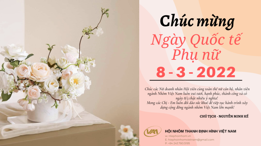 Nhân Ngày Quốc tế Phụ nữ 8/3, Hiệp hội Nhôm Việt Nam xin chúc các Nữ doanh nhân Hội viên cùng toàn thể nữ cán bộ, nhân viên ngành Nhôm Việt Nam luôn vui tươi, hạnh phúc, thành công và có ngày 8/3 thật nhiều ý nghĩa!