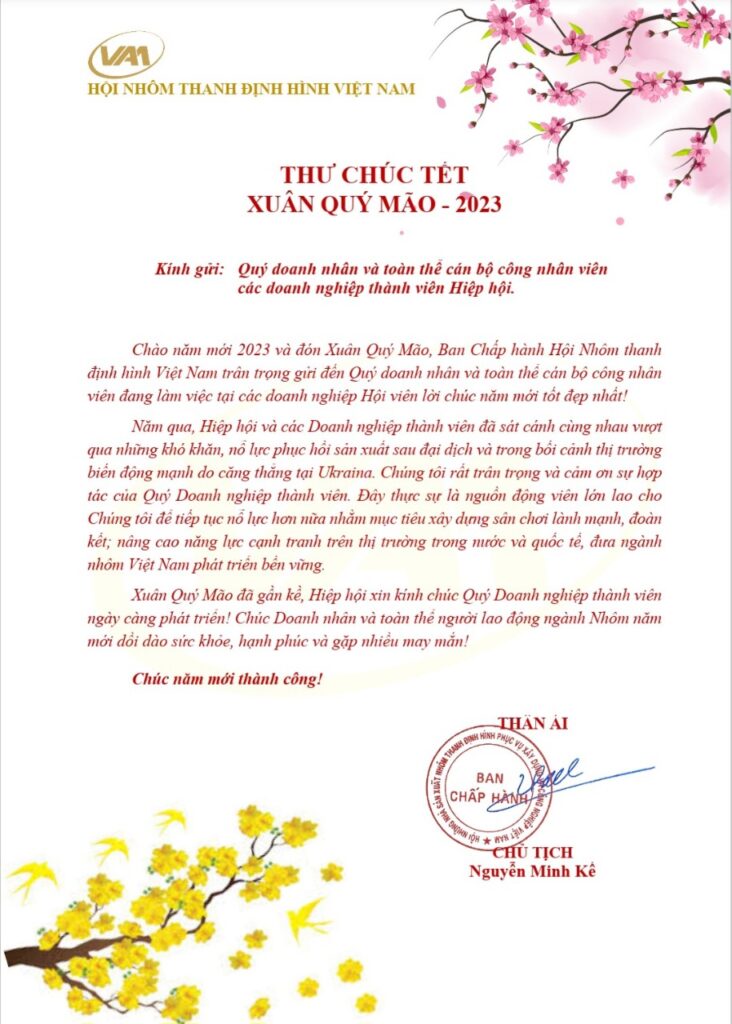Xuân Quý Mão đã gần kề, Hiệp hội xin kính chúc Quý Doanh nghiệp thành viên ngày càng phát triển! Chúc Doanh nhân và toàn thể người lao động ngành Nhôm năm mới dồi dào sức khỏe, hạnh phúc và gặp nhiều may mắn!