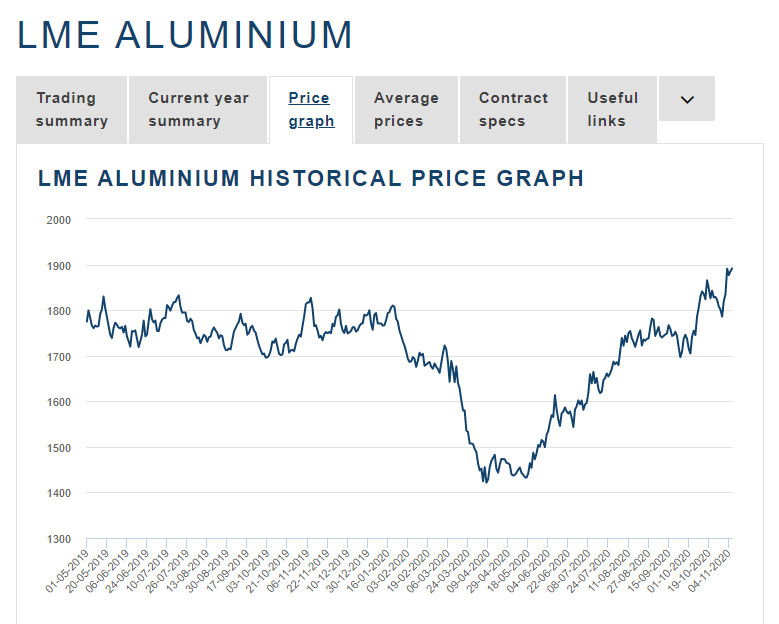 Đầu tháng 11, giá các kim loại công nghiệp tăng cùng với thị trường chứng khoán và giá dầu tăng, do các nhà đầu tư đặt cược Joe Biden sẽ đắc cử Tổng thống Mỹ, người có khả năng làm gia tăng các biện pháp kích thích kinh tế, trong khi số liệu sản xuất tăng mạnh và nguồn cung thắt chặt hơn đẩy giá nhôm tăng lên mức cao nhất 19 tháng.